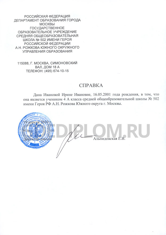 На нашем сайте Вы можете купить справку об обучении в школе, техникуме, институте, университете или академии. Выберите любое учебное заведение, справку из которого Вы хотите получить, свяжитесь с нами и уже через день (если проживаете в Москве и Санкт-Петербурге) Вы получите справку об обучении, выполненную по стандартам нуного Вам ВУЗа, ССУЗа или школы.